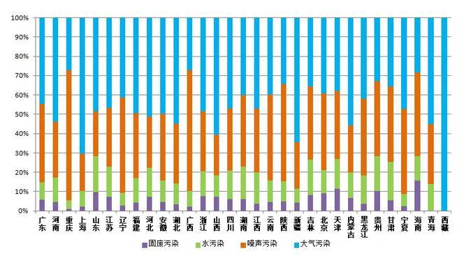 從各省舉報(bào)污染類型占比來看,上海、新疆大氣污染舉報(bào)在當(dāng)?shù)卣急容^高,占比高于全國平均水平13個(gè)百分點(diǎn),其中上海主要反映工業(yè)廢氣和油煙問題,新疆主要反映惡臭異味問題。重慶、廣西噪聲污染舉報(bào)在當(dāng)?shù)叵鄬ν怀觯急瘸^全國平均水平近20個(gè)百分點(diǎn),兩地主要反映建筑施工噪聲問題。甘肅、山東、貴州、吉林水污染舉報(bào)在當(dāng)?shù)卣急容^高,超過全國平均水平約5.5個(gè)百分點(diǎn)。