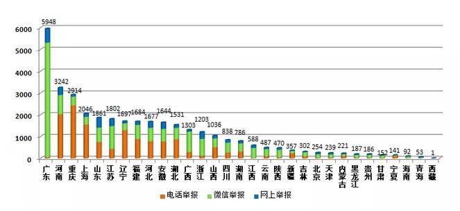 從各地區(qū)不同渠道舉報(bào)數(shù)量看,廣東、河南、重慶等地舉報(bào)量居前,重慶、河南、上海等地電話舉報(bào)占比較高,廣東、江蘇、廣西等地微信舉報(bào)占比較高。
