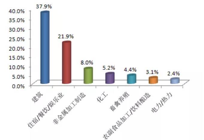 從行業(yè)類型來看,11月公眾反映***集中的行業(yè)是建筑業(yè),占37.9%,其次為住宿餐飲娛樂業(yè)和非金屬加工制造,分別占21.9%和8.0%。其中,建筑業(yè)占比環(huán)比下降約11個(gè)百分點(diǎn),非金屬加工制造業(yè)和化工業(yè)舉報(bào)占比環(huán)比分別約上升2.1和1.4個(gè)百分點(diǎn)。此外,電力熱力業(yè)占比排名攀升至第7名,超過垃圾處理業(yè)。