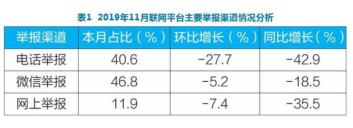 2019年11月聯(lián)網(wǎng)平臺(tái)主要舉報(bào)渠道情況分析